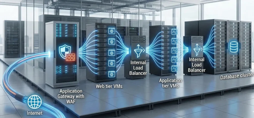 - Internet traffic → Application Gateway (with WAF) → Web tier VMs