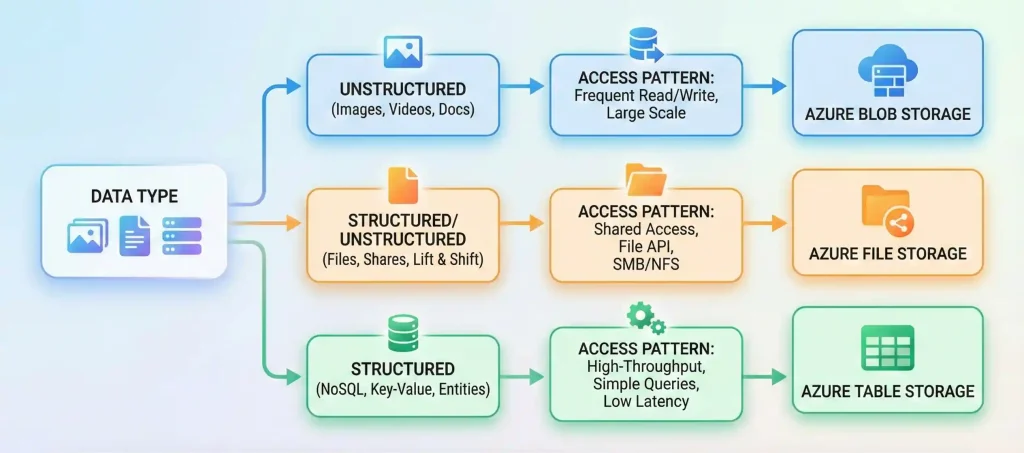 Choosing between Azure Blob, File, and Table Storage isn't complicated once you understand their strengths. The key is matching the storage type to your data characteristics and access patterns.