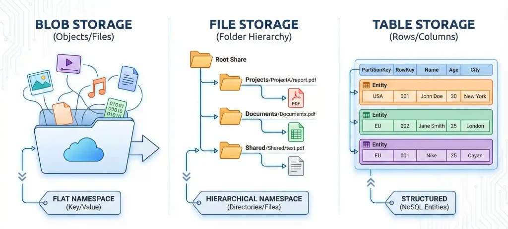 | Data Type | Unstructured (objects/blobs) | Hierarchical (files/folders) | Semi-structured (key-value) |