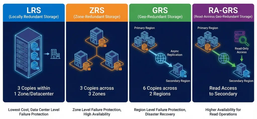 All three storage types support these options, though availability varies by region and account type. For production workloads, I typically recommend at least ZRS. The small cost increase is worth the peace of mind.