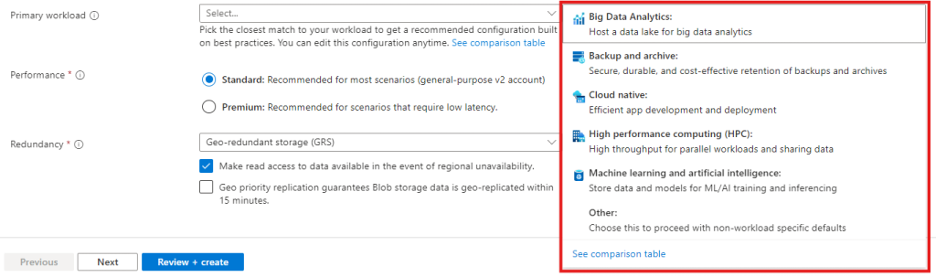 | Backup and Archive | Select this for BCDR strategies. It optimizes for cost-effective, long-term data retention and cool/archive tiers. |