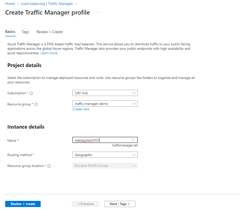 Select subscription --> Resource group , provide unique name for the traffic manager and Must need to provide Routing method.
