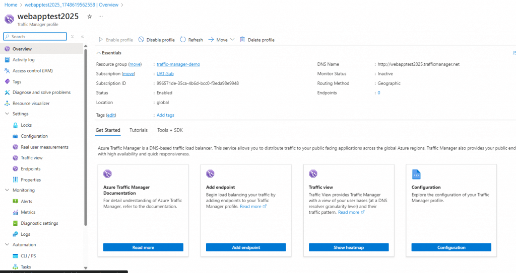 In this overview page we can see much of the details of azure traffic manager profile.