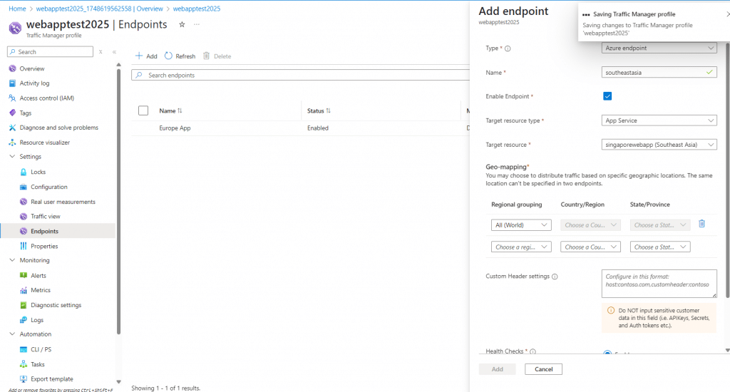 ☑️In this Geo-mapping we can distribute traffic based on specific geographic locations. You cannot select same location to two endpoint. Finally enable Health Checks.