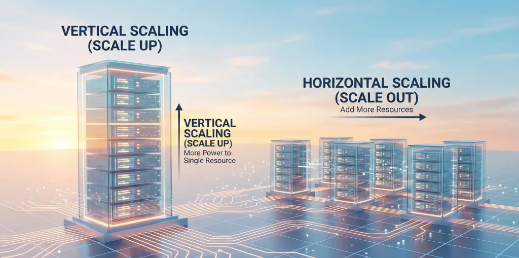 With VMs, you have two options. Vertical scaling means upgrading to a bigger VM – more CPU, more RAM. Horizontal scaling means adding more VMs behind a load balancer using Virtual Machine Scale Sets (VMSS).