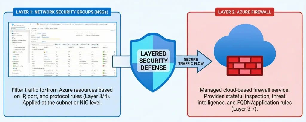 The best Azure networks use both NSGs and Azure Firewall together. This is called "defense in depth"—multiple layers of security.
