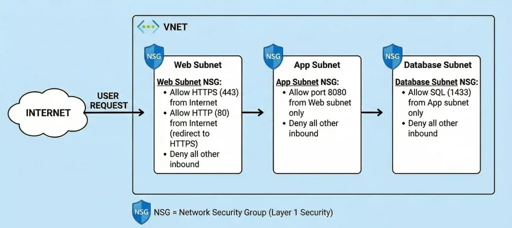 - Subnets: All resources in that subnet inherit the NSG rules.