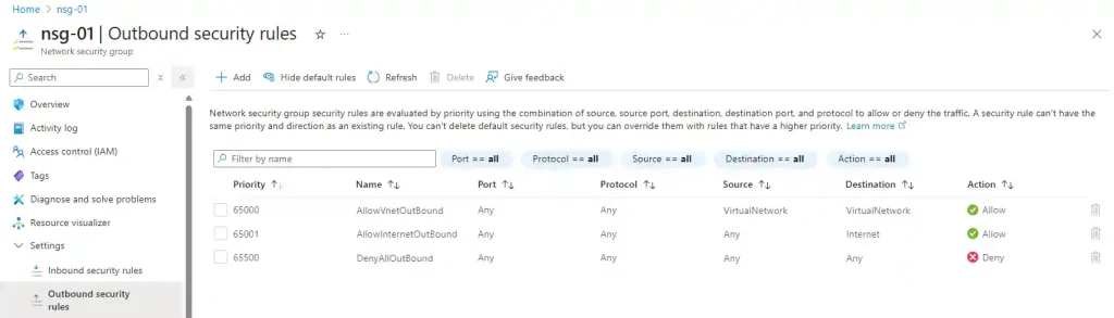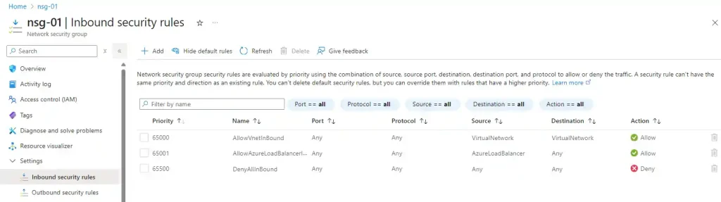 Every NSG comes with default rules you cannot delete (but can override). Here's what you get:
