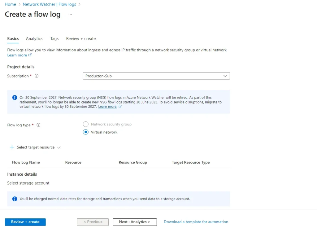 Important update: NSG flow logs will be retired on September 30, 2027. Microsoft recommends migrating to Virtual Network flow logs, which offer more capabilities. If you're starting fresh, go straight to VNet flow logs. After June 30, 2025, we no longer be able to create new NSG flow logs.