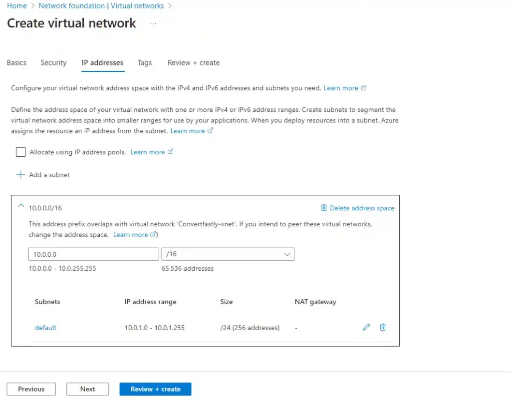 - Create a VNet with a defined address space (e.g., 10.0.0.0/16).