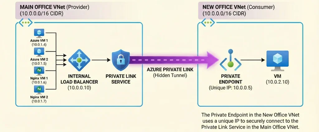 - In the New Office (Consumer) side, we create a "Private Endpoint." This is a special network interface that gets a unique IP address inside the New Office VNet.