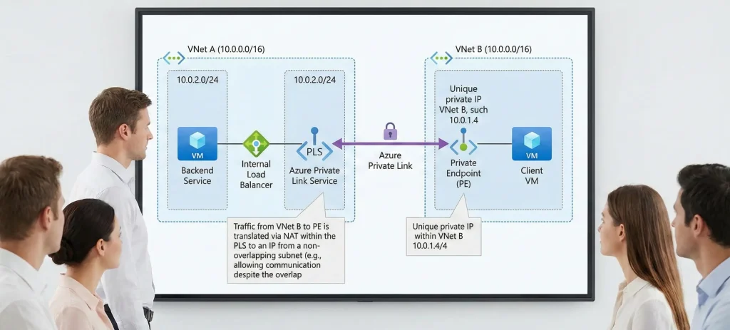 When a user in the New Office wants to access the app, they don't connect to the conflicting Main Office IP. They connect to their own local Private Endpoint IP. Azure handles the network translation magic in the middle.