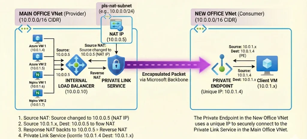 When your Client VM (10.0.1.x in New Office) sends a request to the Private Endpoint (10.0.1.4), Azure encapsulates that packet and sends it through the Microsoft backbone network to the Private Link Service in the Main Office.
