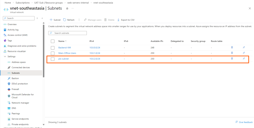 pls-subnet. Give it a small range that doesn't conflict with your existing workloads, for example,10.0.2.0/24. - Important: In the subnet properties, ensure that "Private endpoint network policies" and "Private link service network policies" are disabled (or set to "None"). This is required for the NAT subnet.