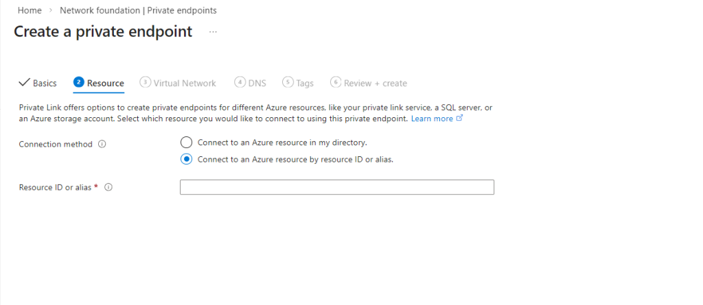 - Connection Method: Select "Connect to an Azure resource by resource ID or alias".