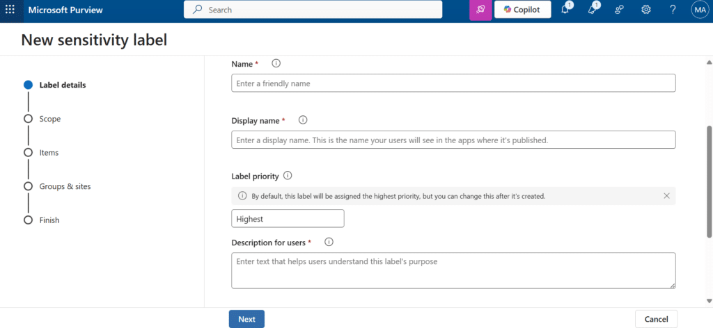 - Description: Add a description for the label. This helps users understand the purpose of the label. For example, “This label should be applied to documents containing confidential financial information.”