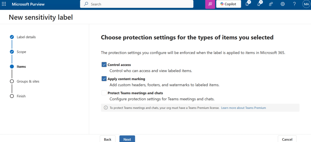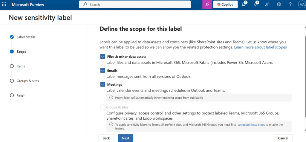 - Define the scope: Choose what the sensitivity label will protect by selecting one or more of the following options.