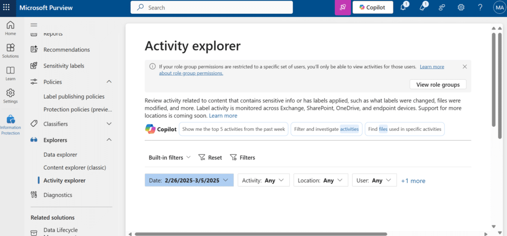 - Under Information Protection, go to Activity explorer to track how labels are being applied across your organization.