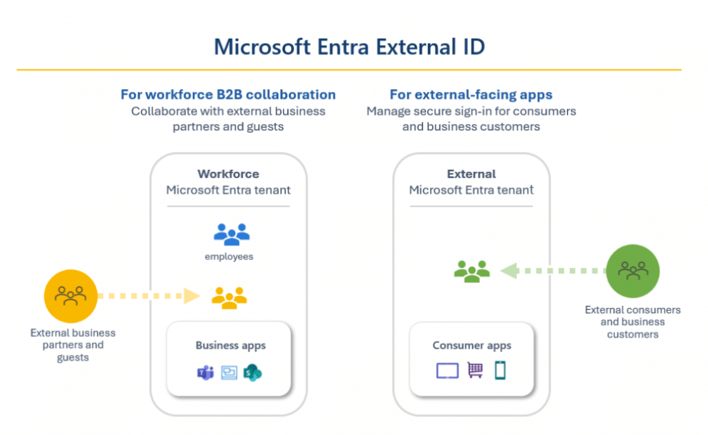 Microsoft Entra External ID brings together powerful options for collaborating with people outside of your enterprise. External ID capabilities enable external identities to safely access your apps and resources. Whether you're interacting with external partners, consumers, or corporate customers, users can bring their own identities.