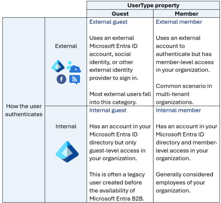 User IDs represent both internal and external users (customers, consultants, vendors, and partners). In Microsoft Entra ID, user identities are defined by their authentication method and the user type parameter.