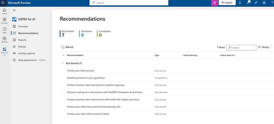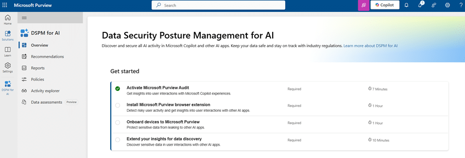 From Overview, review the Get started section to learn more about Data Security Posture Management for AI, and the immediate actions you can take. Select each one to display the flyout pane to learn more, take actions, and verify the status.