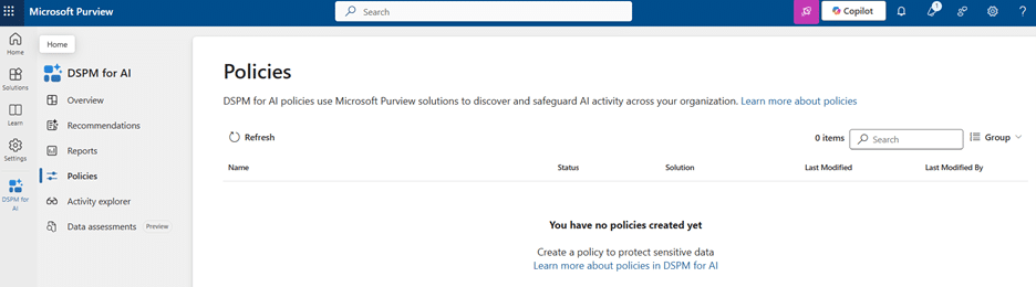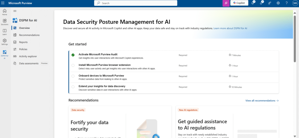 - Sign in to the Microsoft Purview portal > Solutions > DSPM for AI.