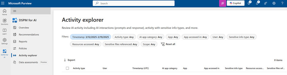 Select Activity explorer to see details of the data collected from your policies. This more detailed information includes activity type and user, date and time, AI app category and app, app accessed in, any sensitive information types, files referenced, and sensitive files referenced.