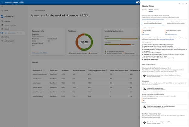 These options include running a data assessment across SharePoint sites, creating sensitivity labels and policies to protect your data, and creating some default policies to immediately help you detect and protect sensitive data sent to generative AI sites.