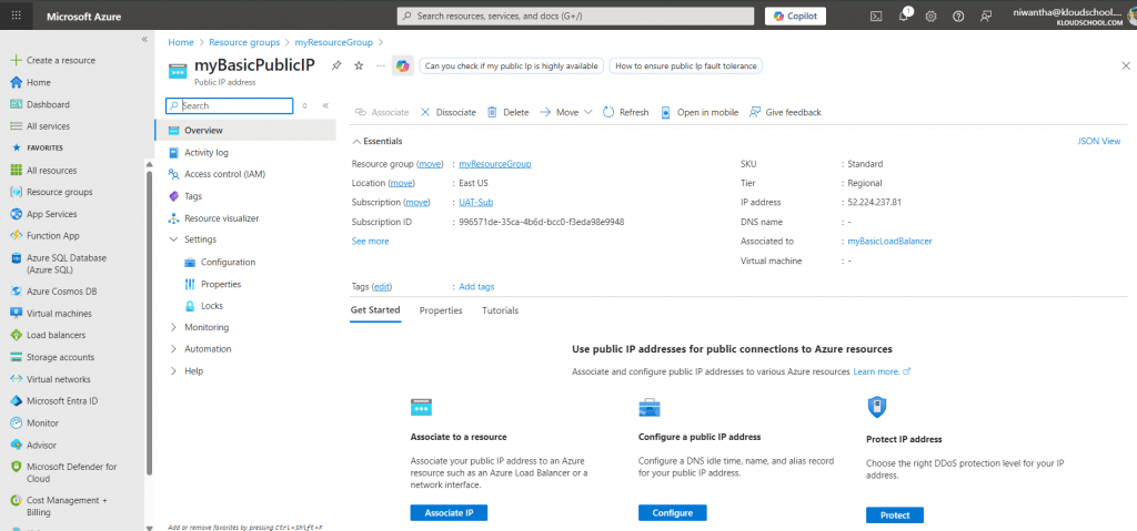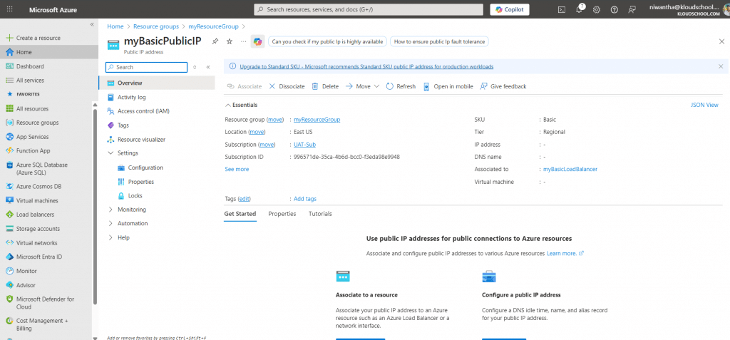 Note: The Basic public IP address shown here was originally created using Azure Cloud Shell with Bash. Since Basic IP addresses are no longer supported, the IP address does not appear in the current configuration.
