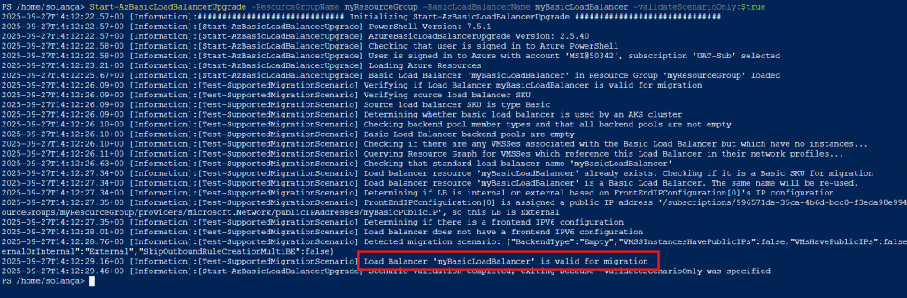 -validateScenarioOnlyflag to confirm your load balancer is eligible for this automated upgrade. This is a non-destructive check. (Replace Resource Group Name and Basic Load balancer Name)Start-AzBasicLoadBalancerUpgrade -ResourceGroupName -BasicLoadBalancerName -validateScenarioOnly:$true